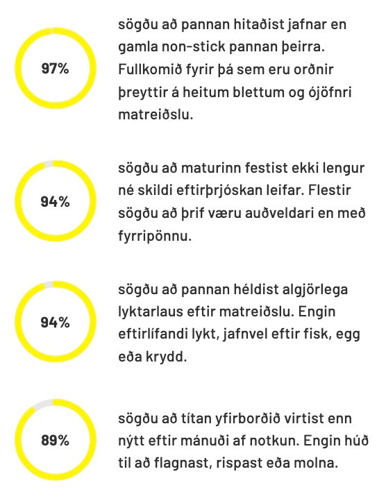 Hverjum degi kemur pannan þín í beint samband við matinn sem þú eldar. Gamlar non-stick pönnur rispast auðveldlega, gleypa lykt og mynda húð sem slitnar með tímanum, sem hefur áhrif á smekk, matreiðslugæði og þrif. Títan forðast öll þessi vandamál: það gleypir ekki lykt, hefur enga húð sem flagnar og þrífst hreint á örfáum sekúndum. Þetta er endingargott, áreiðanlegt yfirborð sem heldur matnum ferskum í bragði og einfaldar eldhúsrútínuna.