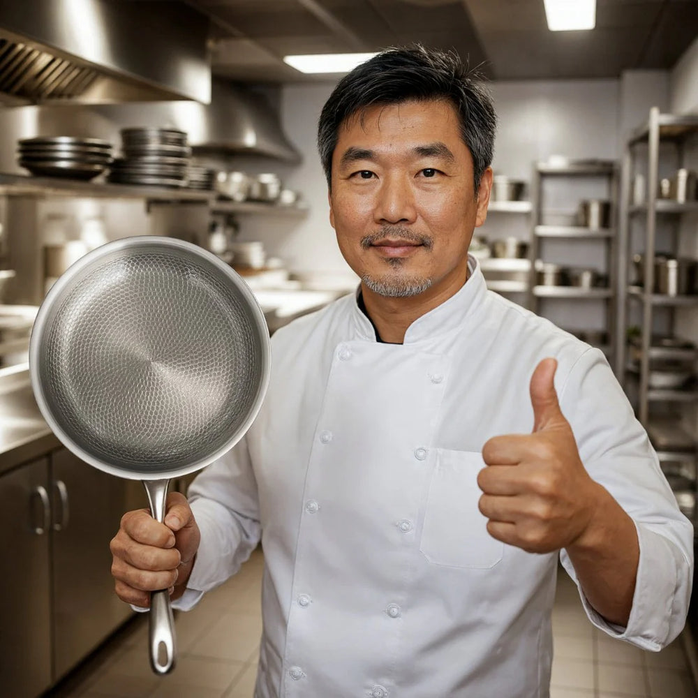 Að búa til raunverulega hágæða eldhúsáhöld er ekki eitthvað sem hægt er að improvisa; hvert smáatriði þarf að vera íhugað vandlega. Þess vegna var þessi hreina títanpanna hönnuð frá grunni til að leysa dagleg vandamál sem heimakokkar mæta oft: pönnur sem halda lykt, missa húðflöguna, festa mat, hitna ójafnt og verða erfiðari í þrifum með tímanum. Þessi panna gerir hið gagnstæða. Hún er náttúrulega non-stick án húðar sem flagnar, helst algjörlega